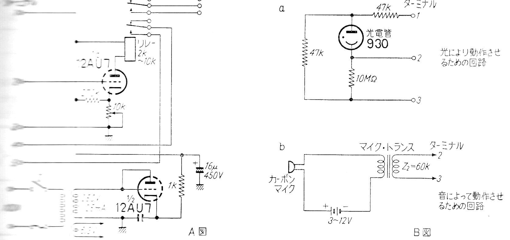 Este relé puede operar con diversos tipos de señales de entrada como, por ejemplo, una válvula foto-multiplicadora (sensor de luz) o un micrófono. El circuito es de una documentación antigua e incluye la fuente de alimentación. El relé es de alta tensión con 2k a 10 k de resistencia de bobina. Lo encontramos en una documentación antigua de los años 60.