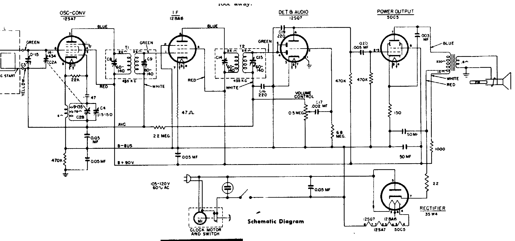 Este receptor para ondas medias usaba 5 válvulas y tenía fonógrafo incluido. El circuito tenía buen rendimiento con la antena de cuadro y los filamentos se conecta en serie.