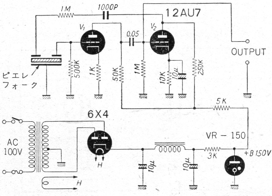 Este circuito fue obtenido en una publicación japonesa de 1960. Se utilizaba como referencia de frecuencia para el ajuste de radios de la época. El circuito puede operar en otras frecuencias dependiendo del resonador.