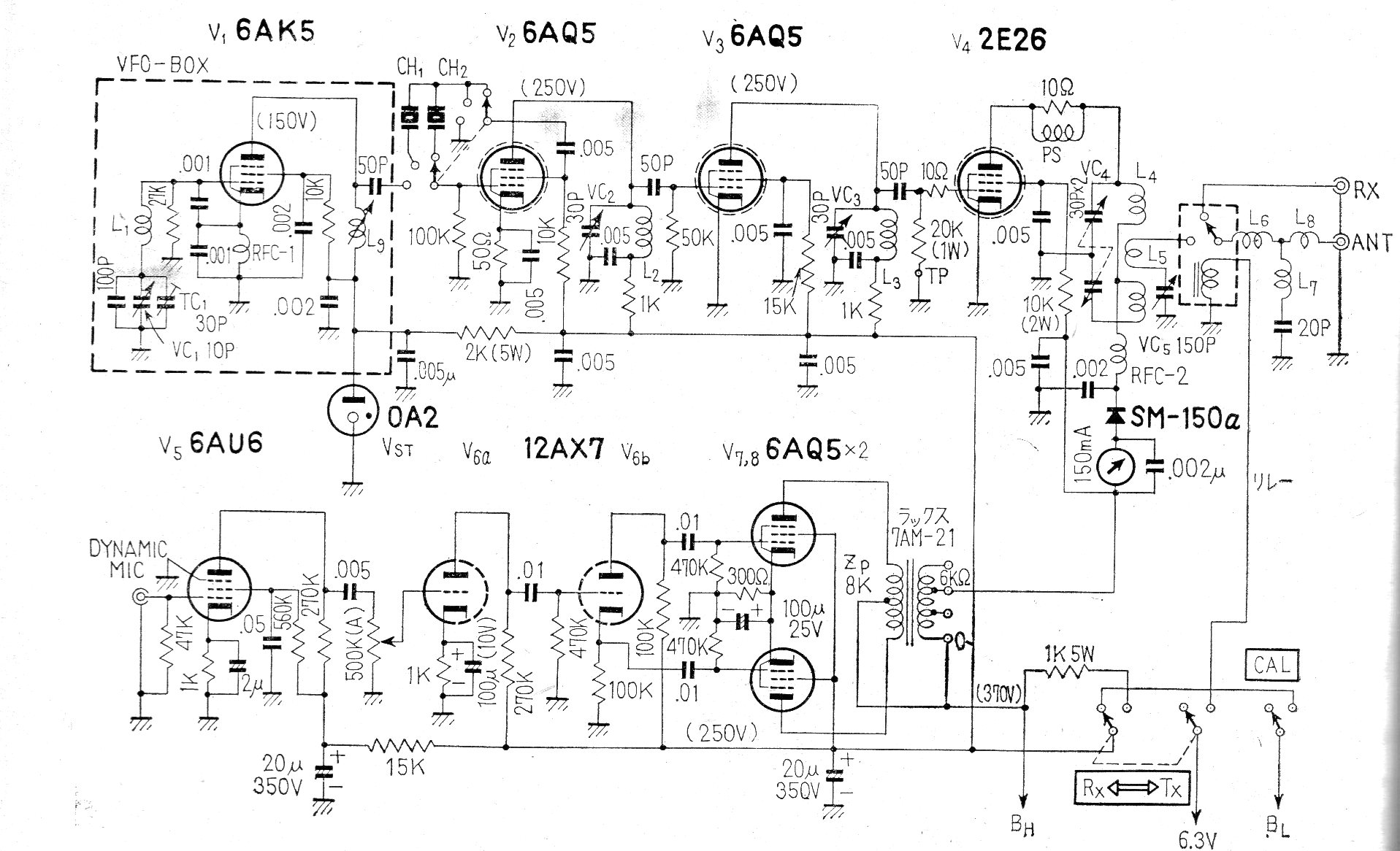 Este transceptor valvular fue encontrado en una publicación japonesa de 1968. Los componentes de la época ya no se encuentran fácilmente y los detalles de las bobinas no se han dado.