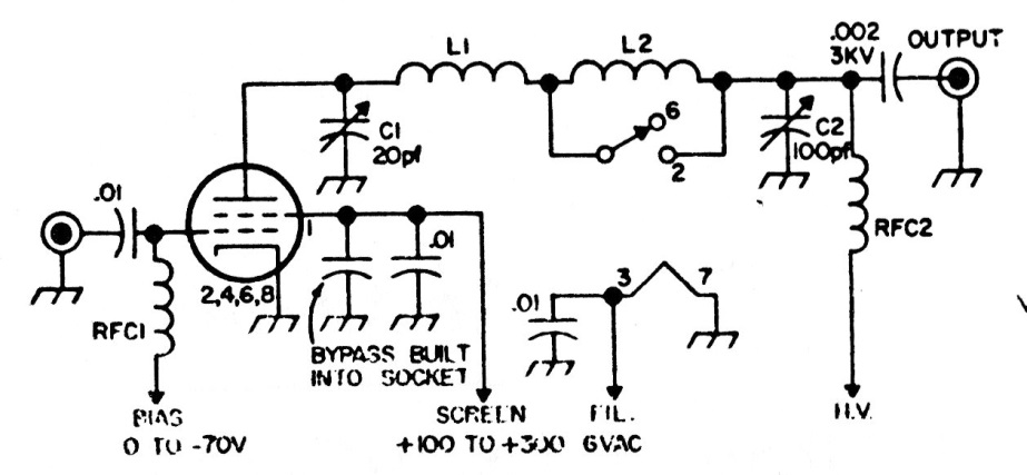 Este circuito actúa como un booster o "botina" (cómo son llamados estos amplificadores en Brasil) para transmisores de radioaficionados siendo excitado por una potencia de 10 W. Los datos de las bobinas no se suministran, pero dependen de la frecuencia de operación.