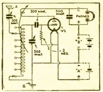Adecuado para principiantes, este radio de válvula de calentamiento directo es de una publicación de 1942. El circuito tiene escucha de auriculares y una bobina con derivación para el mejor acoplamiento de antena. El receptor es del tipo regenerativo. El auricular debe tener al menos 2000 ohmios de impedancia.