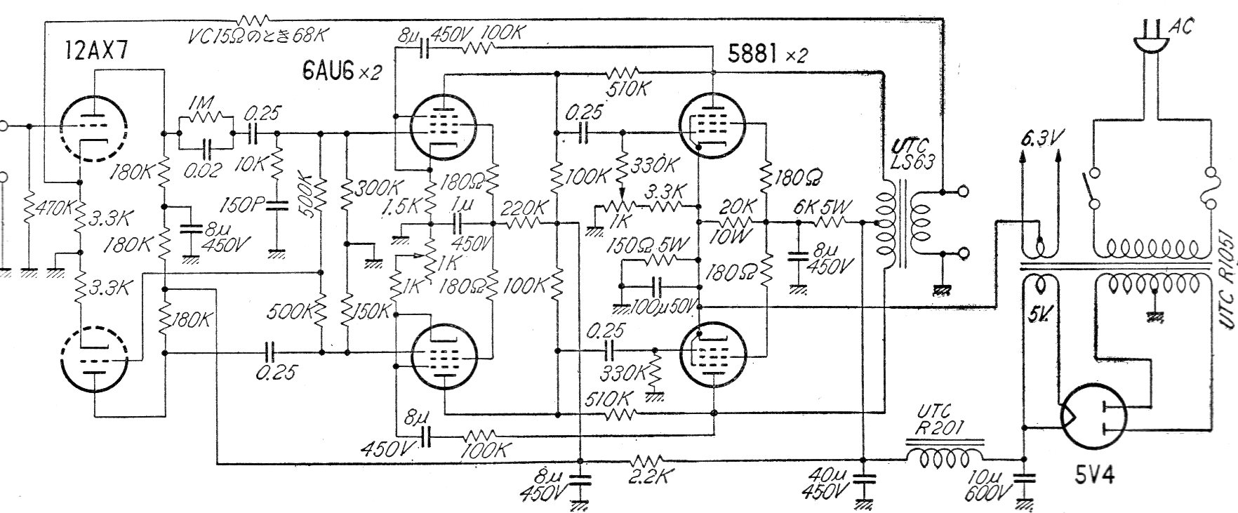 Este amplificador con las válvulas de potencia 5881 fue encontrado en una publicación japonesa de los años 60. El circuito incluye la fuente de alimentación y tiene una etapa de pre-amplificación e inversión de fase sofisticada. Los transformadores son los componentes críticos de este amplificador.