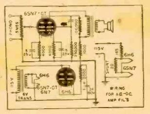 Este circuito de dos válvulas se encontró en la documentación de 1945. Impulsa un pequeño altavoz. El circuito es alimentado por la red directamente, pero los filamentos de las válvulas son calentados por un pequeño transformador.
