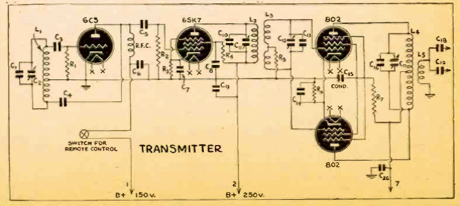 Este transmisor de 10W envía su señal a la red eléctrica para un sistema de comunicación. El circuito es de un Radio Craft de agosto de 1943. La frecuencia utilizada está en el rango de unos pocos cientos de kilohertz.