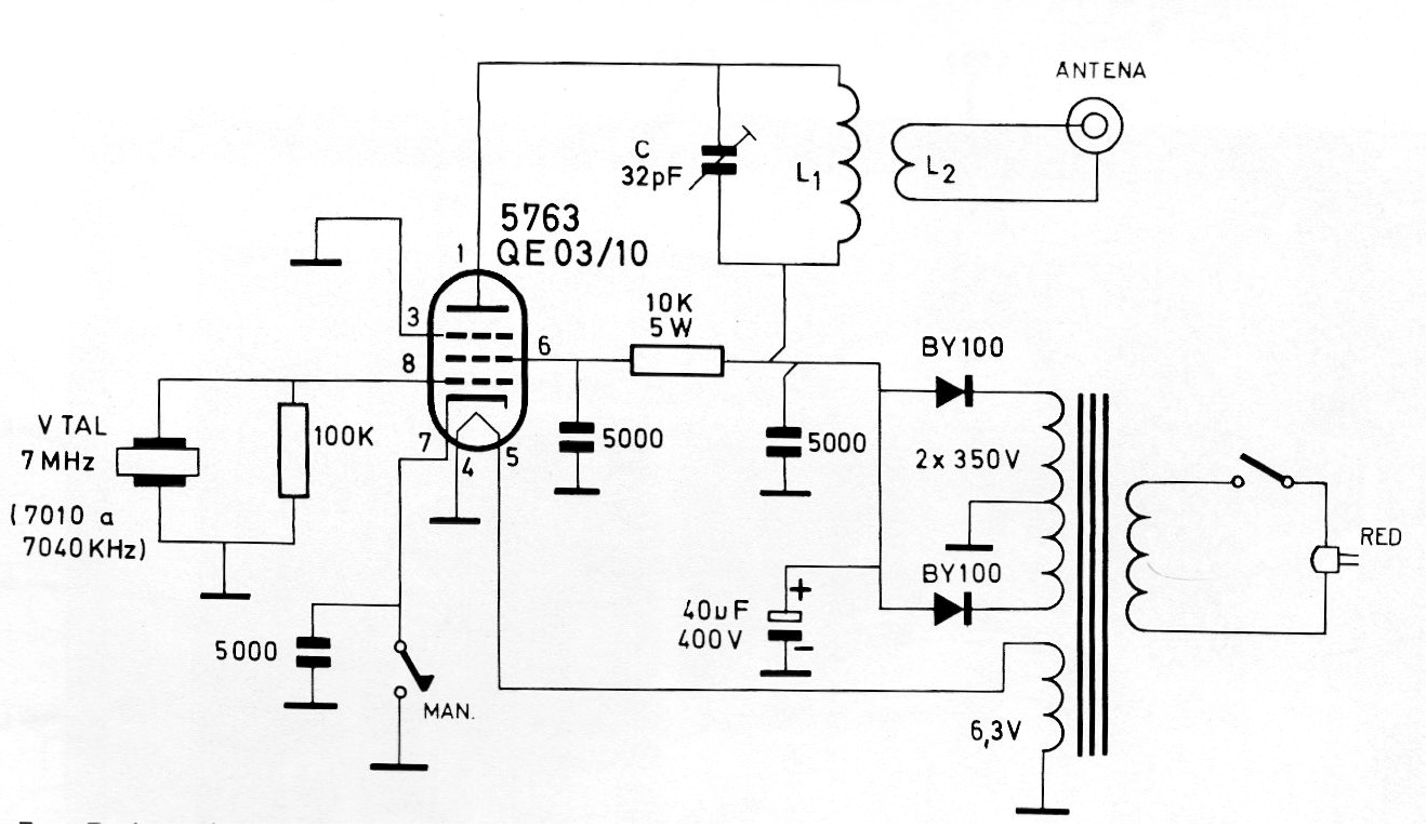 Este transmisor para el rango de 40 metros, usado por radioaficionados es del tipo para CW (Morse) con una sola válvula. Además de la válvula, el componente crítico es el transformador de 350 V x 200 mA o más. La bobina L1 consta de 20 espiras de hilo 28 en un tubo de 2 cm de diámetro, sin núcleo y L2 en 10 espiras del mismo hilo. Los diodos pueden ser los 1N4007. Los capacitores deben ser cerámicos con alta tensión de aislamiento.