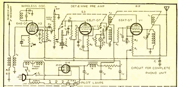Este pequeño transmisor de tubo de 1941 sirve para transmitir señales de un tocadiscos o un micrófono como una pequeña estación de radio. El circuito se alimenta de la red eléctrica, sin necesidad de transformador y tiene un alcance de unas decenas de metros. Lo encontramos en una documentación de la época.