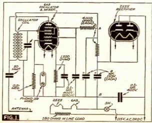 Este circuito alimentado por la red se encuentra en la documentación de 1941. El circuito funciona en el rango de onda media o según la bobina oscilante y tiene un alcance de unos pocos metros. Tenga en cuenta el uso de una válvula rectificadora dual. El oscilador es del tipo que normalmente se usa en las radios comunes como convertidor.
