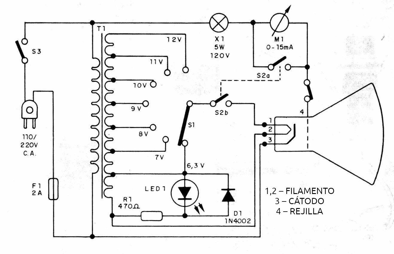 Si esta corriente, tras un máximo de unas pocas repeticiones en ciclos de 2 a 4 minutos, no llega a los 15 mA a fondo de escala, repetimos la operación con una tensión de filamento superior, llegando a los 8 V. Tenga en cuenta que la lectura actual que activa S2 solo debe realizarse al final de los ciclos de calentamiento del filamento de 2 a 4 minutos.