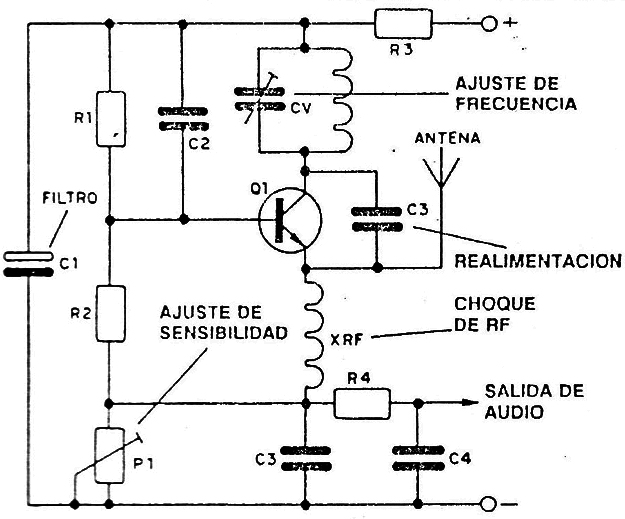 Se trata de una etapa superregenerativa con un transistor que se acopla a una etapa amplificadora con un transmisor más.