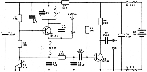 Usando sólo dos transistores este circuito es sensible como para captar estaciones distantes que pueden oírse acoplando un auricular de alta impedancia en su salida (puntos A y B).