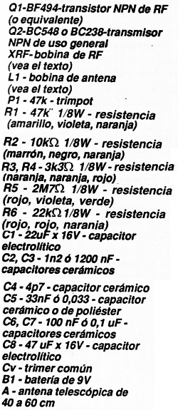 El segundo transistor puede ser BC238, BC239, BC548 o BC549. L1 debe construirlas el armador. L1 está formada por 5 espiras de alambre barnizado 24 o 26 si se hubiera elegido la frecuencia de 72 MHz. Si la frecuencia fuera de 27 MHZ, la bobina tendrá 11 espiras del mismo alambre. No es necesario el núcleo.