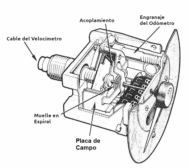 El velocímetro mecánico tradicional funciona realmente como un motor de inducción. Un cable acoplado a la caja de cambios funciona como un sensor de rotación, transmitiendo este movimiento a un imán en la caja del velocímetro.