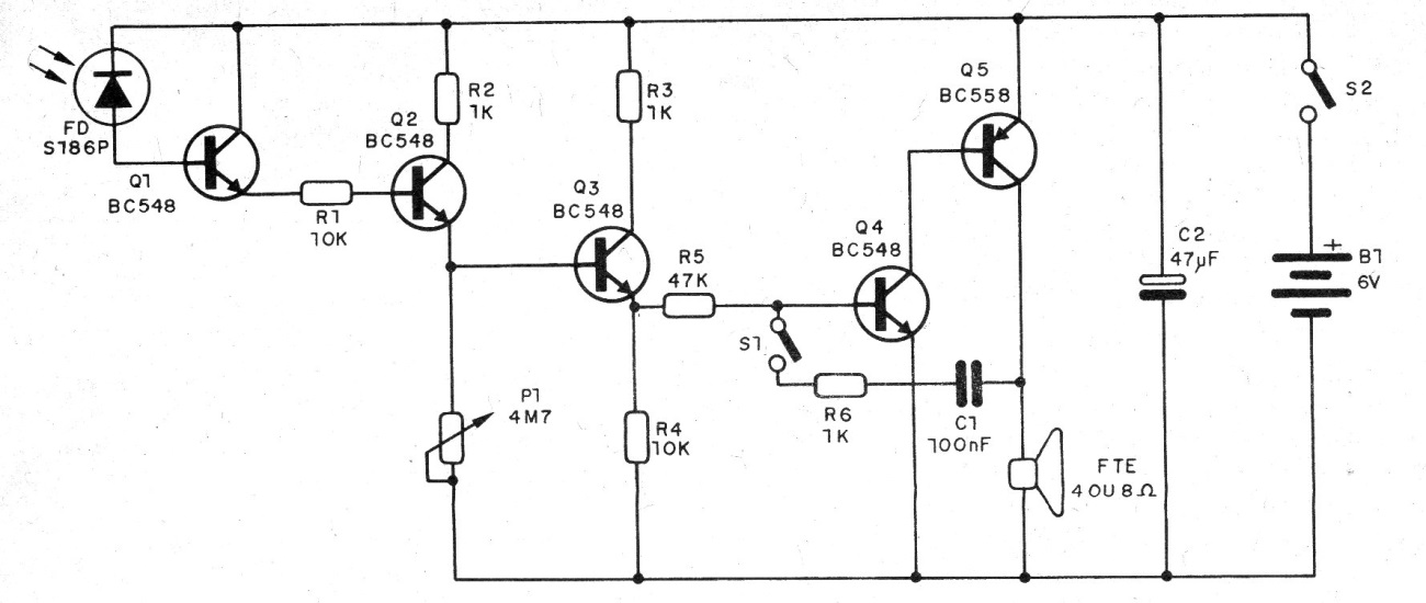 El sonido será más agudo cuanto más intensa se detecte la fuente de radiación. Con la llave S1 abierto, el circuito funciona como un amplificador y es posible escuchar una fuente infrarroja modulada.