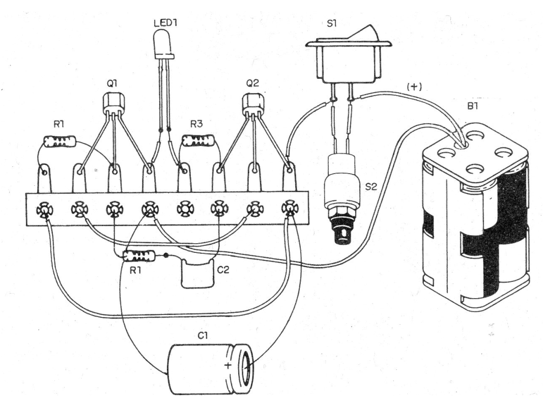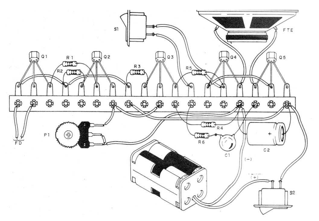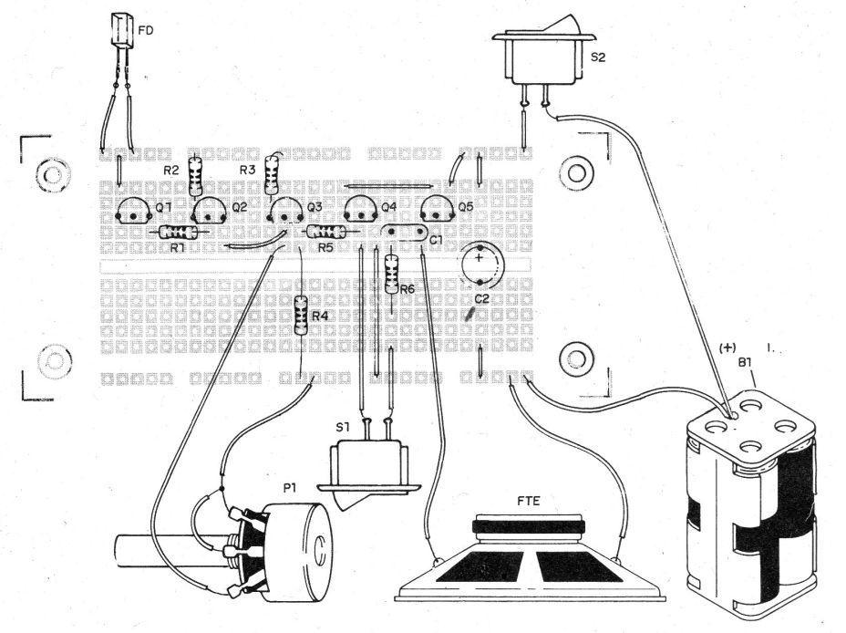 En el montaje, observe atentamente la polaridad del fotodiodo y de todos los transistores, prestando atención al hecho de que Q5 es diferente de los demás.