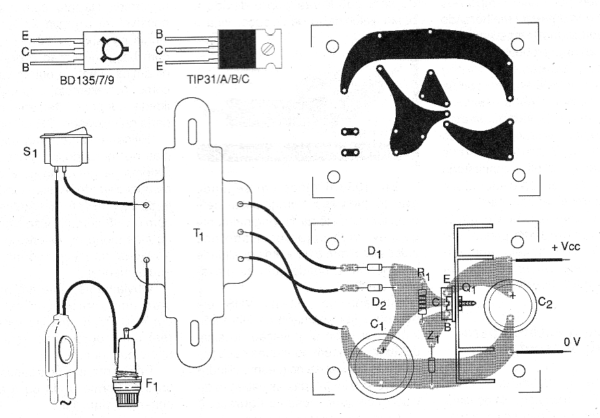 El capacitor C1 debe tener tensión de trabajo por lo menos 50% que la tensión del secundario del transformador usado. El transistor debe estar dotado de un buen radiador de calor. Observe que la disposición de los terminales de los transistores de la serie BD es diferente de la serie TIP.