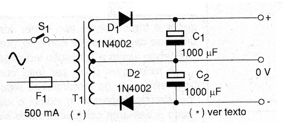 La primera tiene el circuito mostrado en la figura 1, pudiendo ser utilizados transformadores de 5 + 5, 6 + 6, 7,5 + 7,5, 9 + 9 V y hasta 12 + 12 V conforme la tensión deseada en la salida.