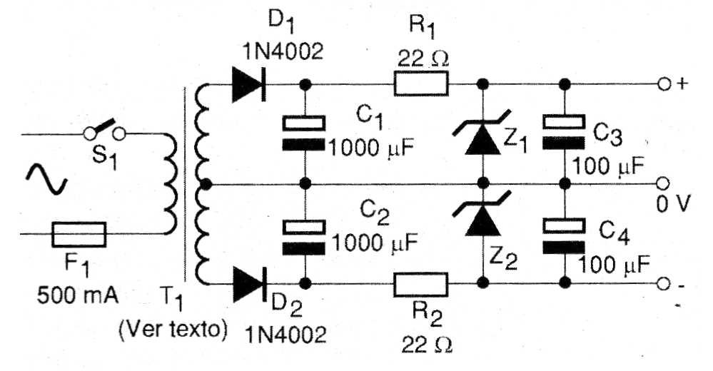 Las tensiones típicas de estas fuentes varían entre 3 y 12 V y las corrientes son bajas, a menos que los circuitos tengan etapas de potencia. Estas corrientes están en el rango de 10 a 500 mA típicamente. A continuación damos dos circuitos de fuentes simétricas simples, una sin regulación y otra con regulación por diodo zener, las cuales pueden ser usadas en la mayoría de las aplicaciones menos críticas que usen amplificadores operacionales y comparadores de tensión.