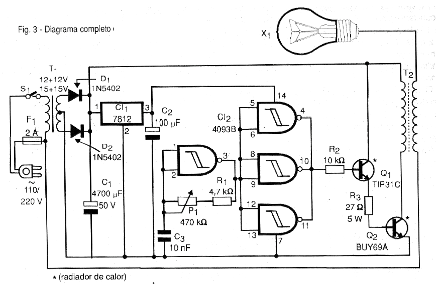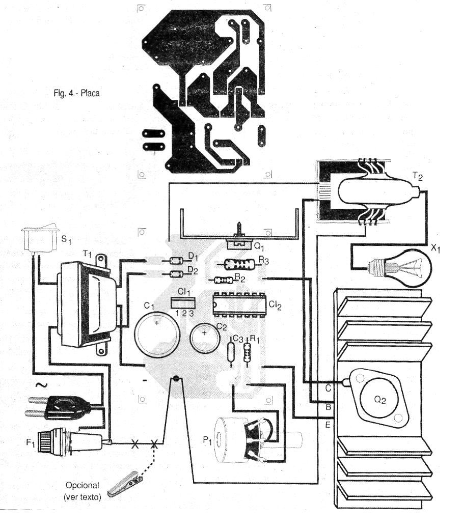 Para mayor seguridad será interesante utilizar un circuito integrado para CI-1. El fusible será importante para la protección del aparato. La lámpara incandescente es del tipo común de filamento de 150 a 300 W. Como no va a haber la circulación de la corriente normal de filamento, y con ello su calentamiento, puede ser tanto de 110V y de 220V, independientemente de la tensión usada en la alimentación del aparato.
