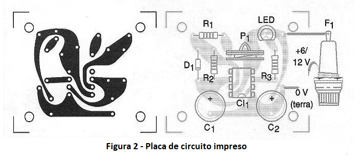 Esta placa se puede fijar en el panel del coche justo cerca del punto en que se va a instalar el LED. El circuito integrado recomendado es el 555 común, pero si el lector puede encontrar la versión CMOS TLC7555, será interesante usarla porque presenta un consumo muchas veces menor que el original.