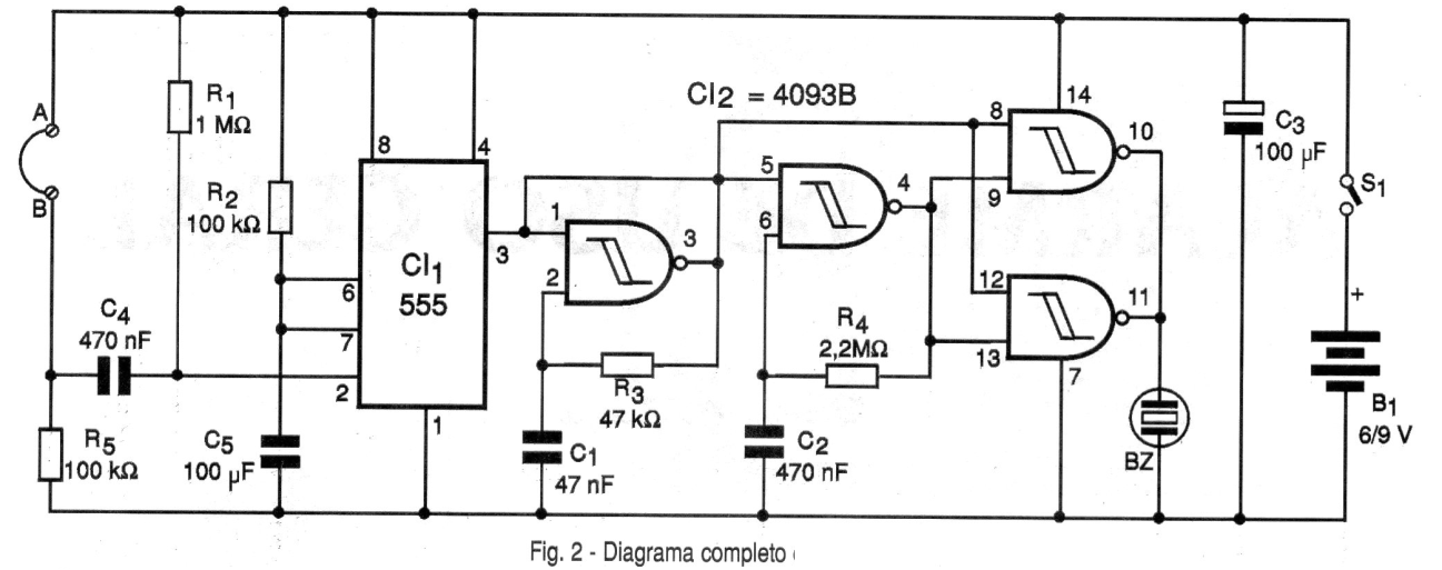 Aunque el eslabón sensor sea rehecho, una vez disparado, el 555 mantendrá su salida en el nivel alto por el tiempo determinado por R2 y C5. La salida del 555 controla dos osciladores disparados elaborados alrededor de las puertas NAND disparadoras de un circuito integrado CMOS del tipo 4093B.