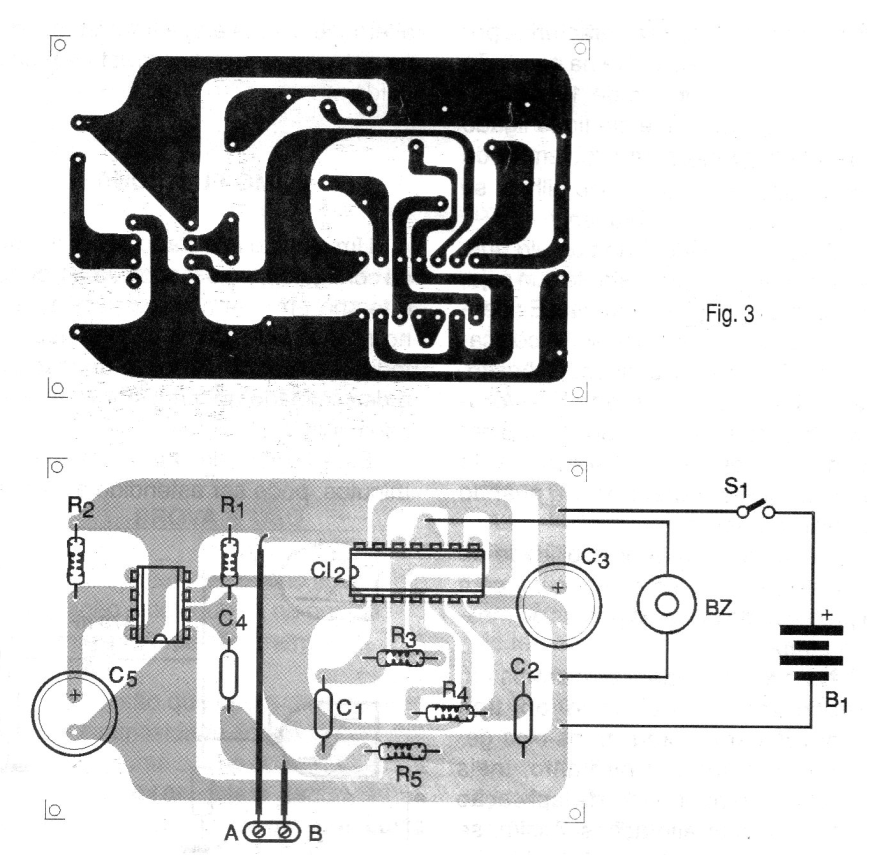 Para probar basta conectar la alimentación con el sensor colocado entre A y B. Desactivando por un instante el sensor debe haber el disparo de la alarma por el tiempo determinado por R2 y C5.