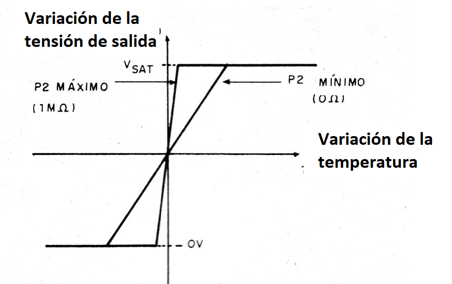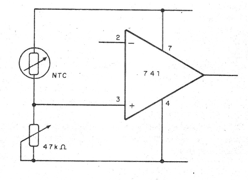 La base del circuito es un amplificador operacional 741 configurado para tener una ganancia ajustable de acuerdo con el rango de temperaturas medida. El sensor es un NTC, que es una resistencia cuya resistencia depende de la temperatura.