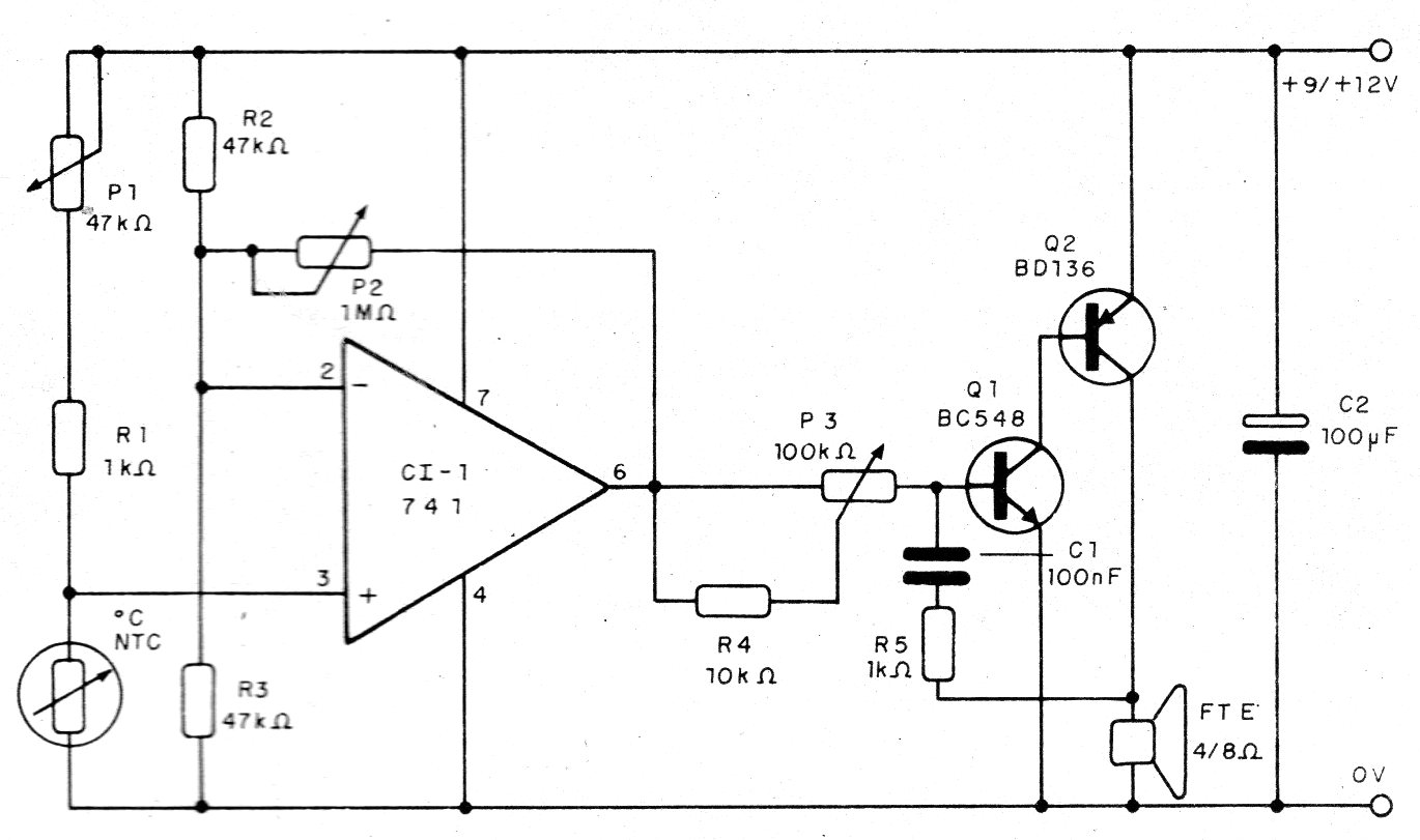 Así, el ajuste de P2 se hará de acuerdo con las características del NTC, ajustado en P1. La señal del amplificador operacional controla un oscilador con dos transistores con un ajuste en P2. La reproducción de la señal de audio generada se realiza en un pequeño altavoz.