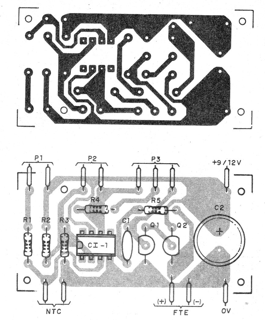 En el montaje, observe la posición del circuito integrado y de los transistores. El NTC puede ser de cualquier tipo con resistencias de 10 k a 100 k a temperatura ambiente.