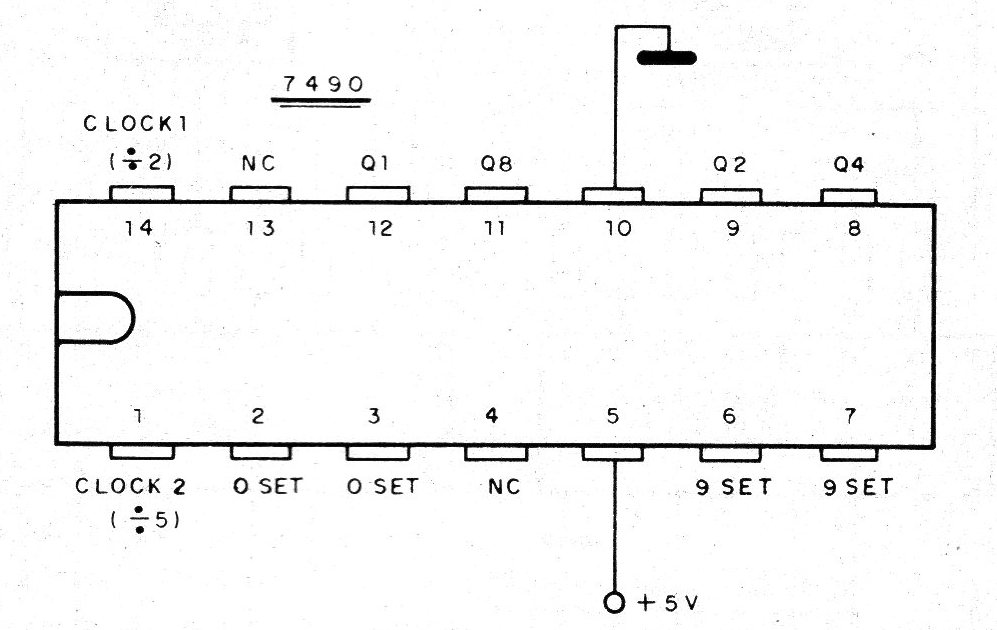 Cada 7490 contiene un divisor por 5 y un divisor por 2, que se pueden utilizar por separado o en conjunto para la división o recuento hasta 10. Este integrado cuenta sólo progresivamente, y tiene salidas en binario con pesos 1, 2, 4 y 8, como muestra la pinza del componente en la figura 1