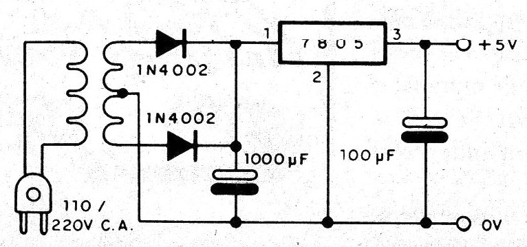 El integrado reguladores de tensión debe estar dotado de radiador de calor y el transformador tiene un secundario de 1 A. En la figura 4 tenemos el diagrama completo de un módulo.
