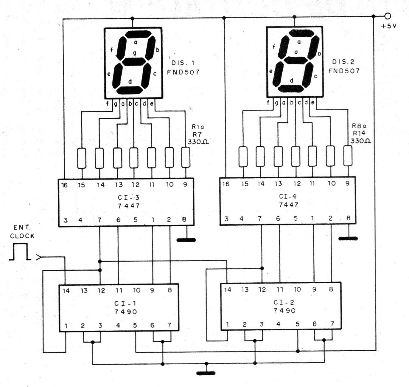 Se utilizan dos contadores del tipo 7490, dos decodificadores con latch del tipo 7447 y dos displays de anodo común, permitiendo así un recuento de 00 a 99. Sin embargo, nada impide que el circuito se amplíe a recuento hasta valores mayores. Como se trata de circuito TTL, la alimentación debe ser hecha con 5 V estabilizados.