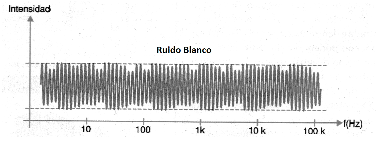 El ruido blanco se caracteriza por tener una intensidad media constante a lo largo de su espectro. En otras palabras, las señales se distribuyen aleatoriamente en el espectro, con intensidad constante. La figura 1 muestra el espectro de un ruido blanco.