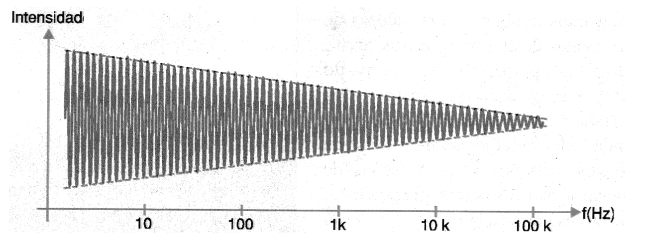 El ruido rosa, por otro, se caracteriza por tener una amplitud decreciente con la frecuencia en un determinado intervalo del espectro, como muestra la figura 2.