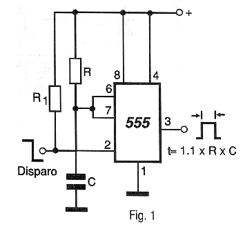Cuando el pinor 2 se dispara por un instante (transición del nivel alto al nivel bajo), la salida del circuito integrado (pin 3) va al nivel alto por un tiempo que depende de R y C en el circuito.