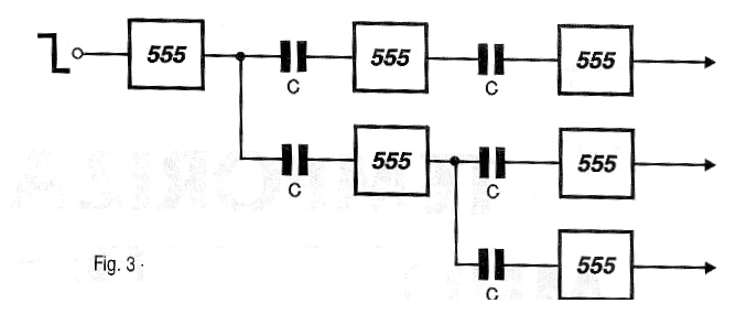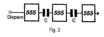 Pues bien, podemos conectar estos bloques en cascada, como muestra la figura 2, de modo que al final de la temporización del primero, el segundo entra en funcionamiento comenzando su temporización. De la misma forma, al final de la temporización del segundo bloque, entra en funcionamiento el tercero y así sucesivamente, cada cual con ajuste independiente de tiempo.