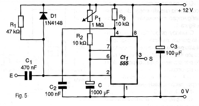 El capacitores C deberá ser dimensionado de acuerdo con la temporización deseada pudiendo variar entre 1 y 2200 uF típicamente. El trimpot sirve para hacer un ajuste fino de la temporización.