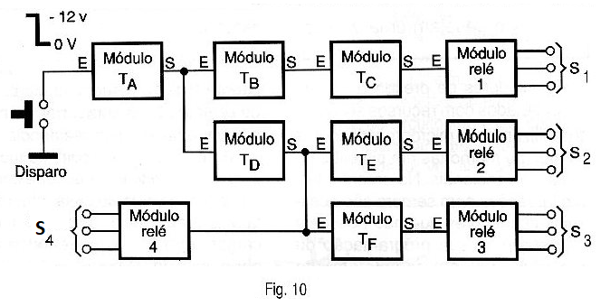 En la figura 10 tenemos un ejemplo de composición de un sistema temporizador múltiple con 4 relés y 6 bloques de tiempo.