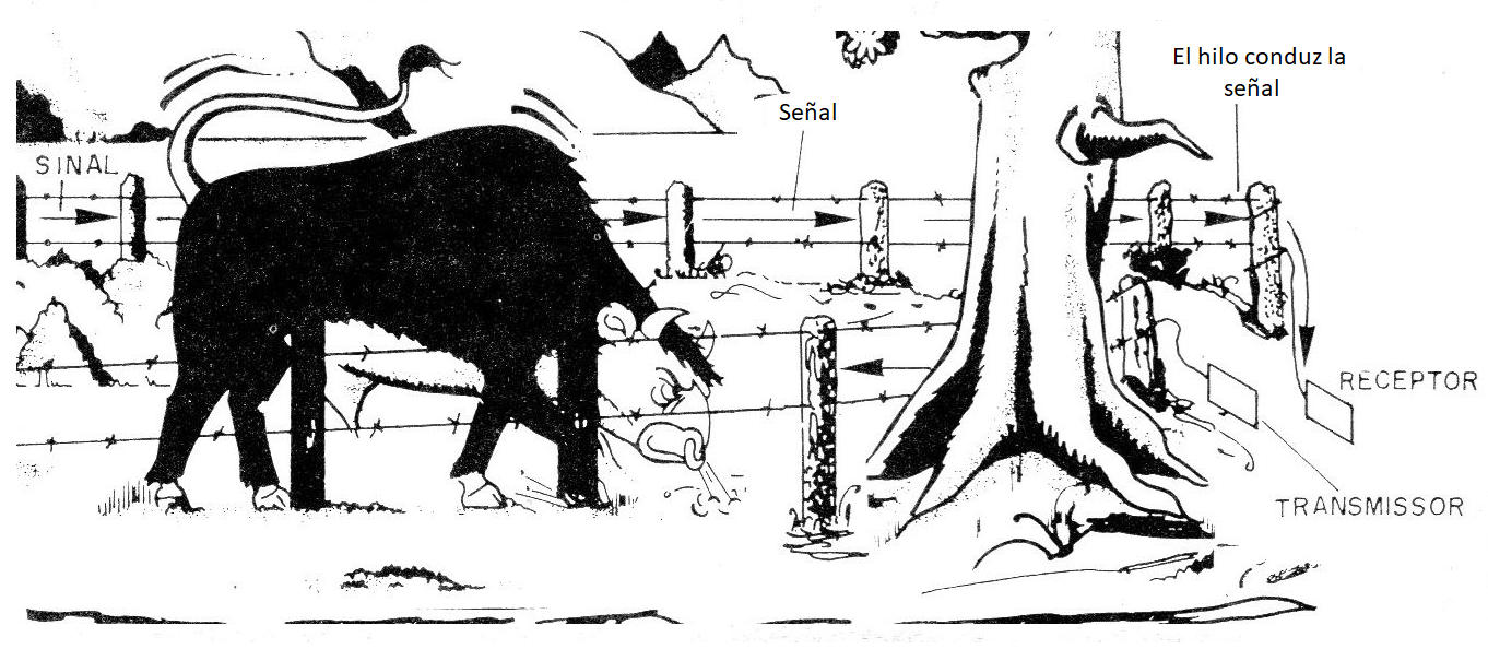 La idea básica para el uso es transmitir la señal en toda la vuelta de un área a través de una cerca de alambre de púas, como se muestra en la figura 6.