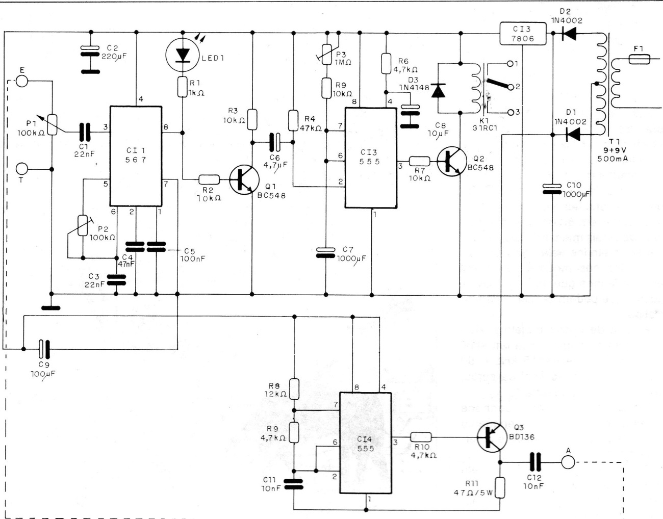 Los circuitos integrados 567 y 555 se montarán en un zócalo. El Cl regulador de tensión C13 así como Q3 necesita radiadores de calor. Si hay dificultades para obtener el 7806 se puede utilizar un 7805 con dos diodos conectados, como se muestra parece 4, en el terminal de ajuste para obtener aproximadamente 6,2 V.