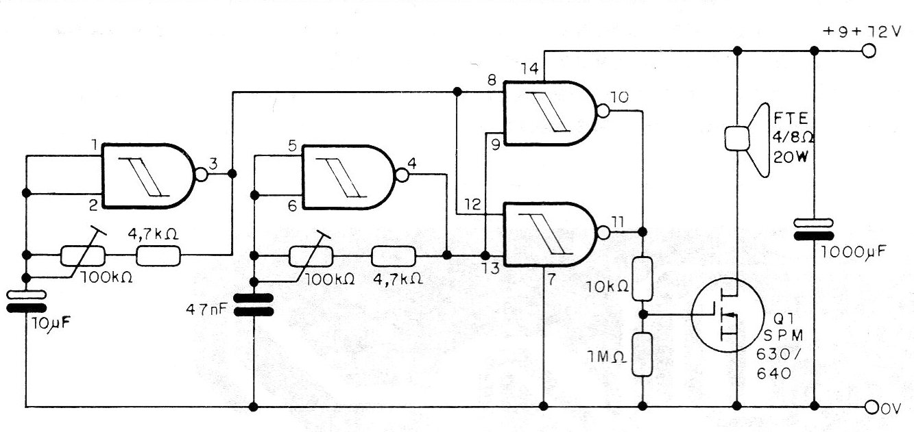 Una sirena potente con transistores de efecto de campo en la salida tiene el diagrama mostrado en la figura 5 y puede ser alimentado directamente desde el punto E del circuito o bien con una fuente de mayor tensión. Para esta sirena sugerimos la utilización de un transformador de 12 + 12 V x 1,5 A.