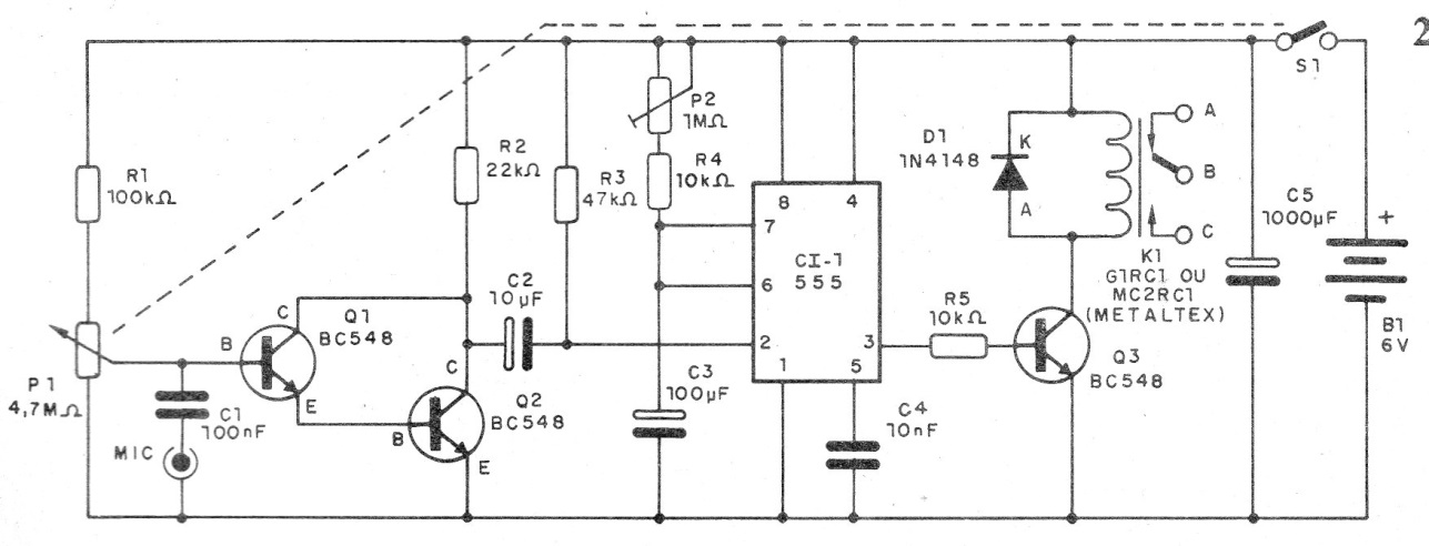 El micrófono de este aparato capta cualquier sonido y dispara un relé manteniéndolo cerrado por el tiempo que ajuste. Usted puede utilizar el circuito para controlar los automatismos o como alarma. Simple de montar, utiliza componentes comunes.