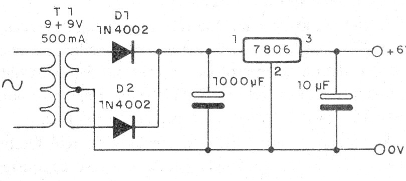 Los resistores son todos de 1/8 W y el micrófono puede ser dinámico o piezoeléctrico. En la figura 4 tenemos una opción de fuente de alimentación para el circuito, usando un regulador 7806.