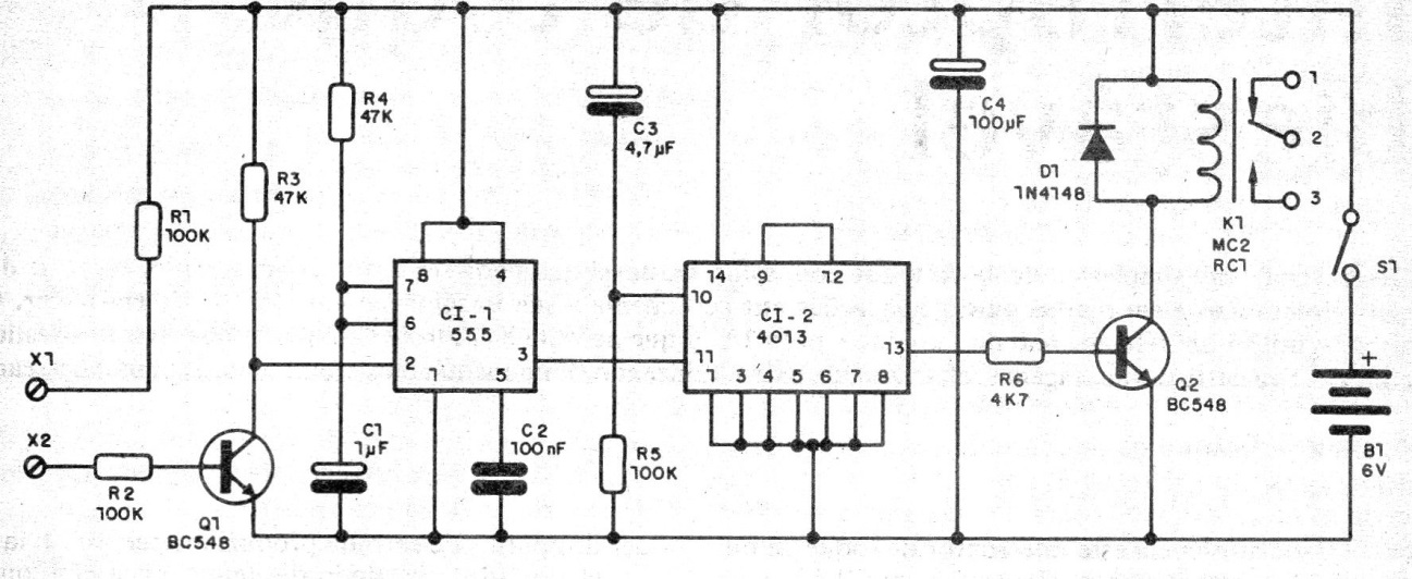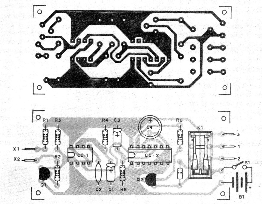 Observe que utilizamos sockets DIL tanto para los integrados como para el relé, que es del tipo micro-relé con bobina de 6 V. Los resistores empleados son todos de 1/8 o ¼ W con cualquier tolerancia.