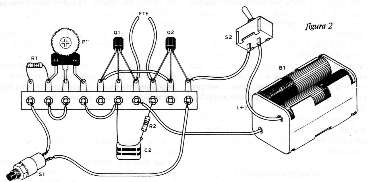 Se utilizan dos transistores complementarios y la alimentación se puede hacer tanto con tensión de 3 V, como de 6 V, lo que corresponde a dos o cuatro pilas pequeñas comunes. El montaje es muy simple, pudiendo ser hecho en puente de terminales o placa de circuito impreso.