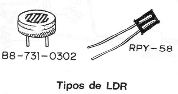 Un segundo componente bastante importante y un poco más crítico, es el elemento sensible, denominado LDR o foto-resistor, que es un dispositivo cuya resistencia depende de la luz incidente y que realiza el disparo del circuito en función, de la luz que incide en él. Este LDR es un tipo normalmente utilizado en controles automáticos de brillo de algunos tipos de televisores y se puede encontrar con facilidad. En nuestro montaje original utilizamos un LDR del tipo B6 731 0302 (IBRAPE), pero equivalentes pueden ser usados, como el RPY-58 o cualquier otro (figura 3) ya que su característica podrá ser compensada por un correcto ajuste del control de sensibilidad.