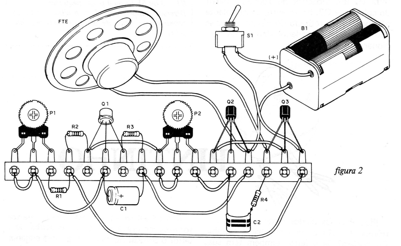 El segundo oscilador utiliza dos transistores complementarios, un PNP y otro NPN, con la realimentación dada por C2 y R4. Este capacitor C2 junto con el ajuste en P2 es que determinan el timbre del canto de la cigarra. El lector puede reducir aún más el capacitor C2 si desea un canto más agudo.