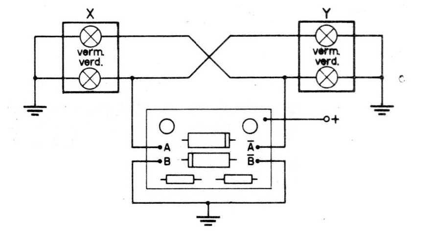 El circuito básico, que describimos permite la alimentación de 4 lámparas de 50 mA © 6 V en serie, lo que posibilita la conexión en circuitos de 12 Volts, tensión esta usada en los autoras y ferrocarriles miniatura. Las lámparas se conectan de tal forma que siempre hay una verde y una roja encendidas, abriendo la señal hacia una vía y cerrando el tráfico a la otra (figura 1).