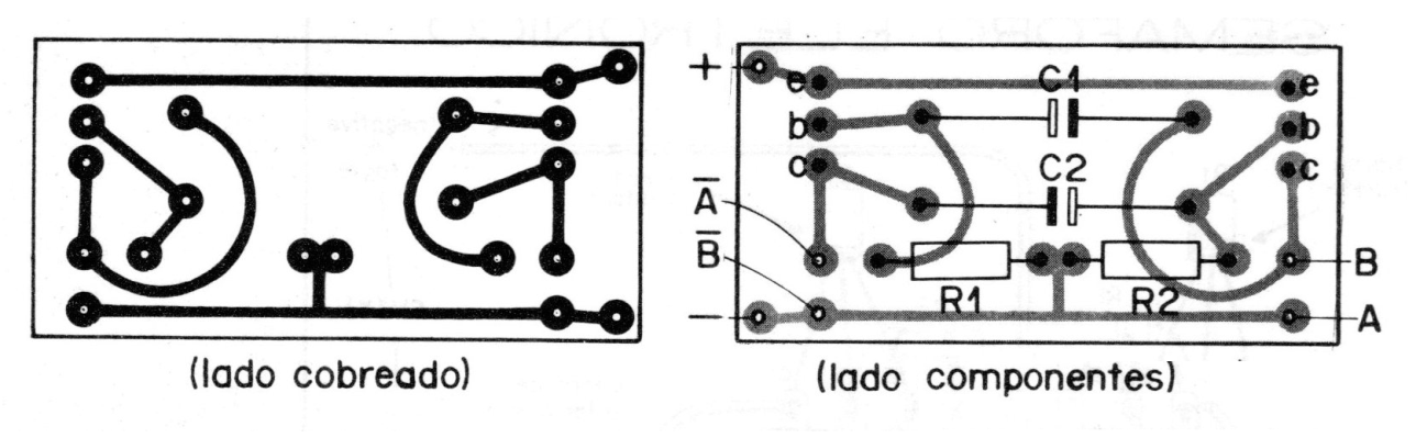 b) La placa de hilatura impresa tiene un lado de cobre y otro no. Después de limpiar el lado cobre, corte en el tamaño dado por el dibujo (figura 6) y con esmalte diluido o símbolos autoadhesivos elabore las conexiones como se muestra en la misma figura abajo.