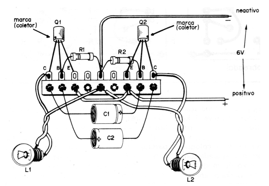 Se utilizan básicamente dos transistores (Q1 y Q2) y dos capacitores (C1 y C2) conectados de tal modo que, en cada instante, sólo uno de los transistores puede permitir la circulación de corriente a través de su colector. Así, si en los colectores de los transistores se han conectado lámparas, en cada instante sólo una de ellas podrá estar encendida. Cuando una apagar la otra obligatoriamente se encender y viceversa.